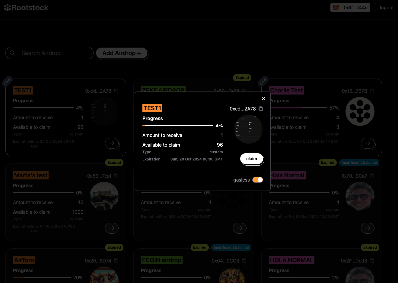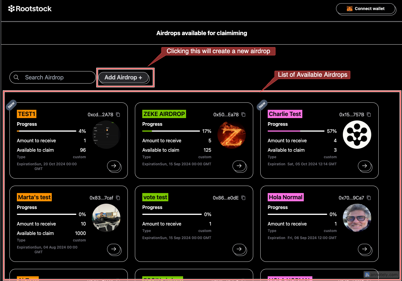 • The first airdrop on the list is called “Test”. Here's a breakdown of what you’ll see on the airdrop card: