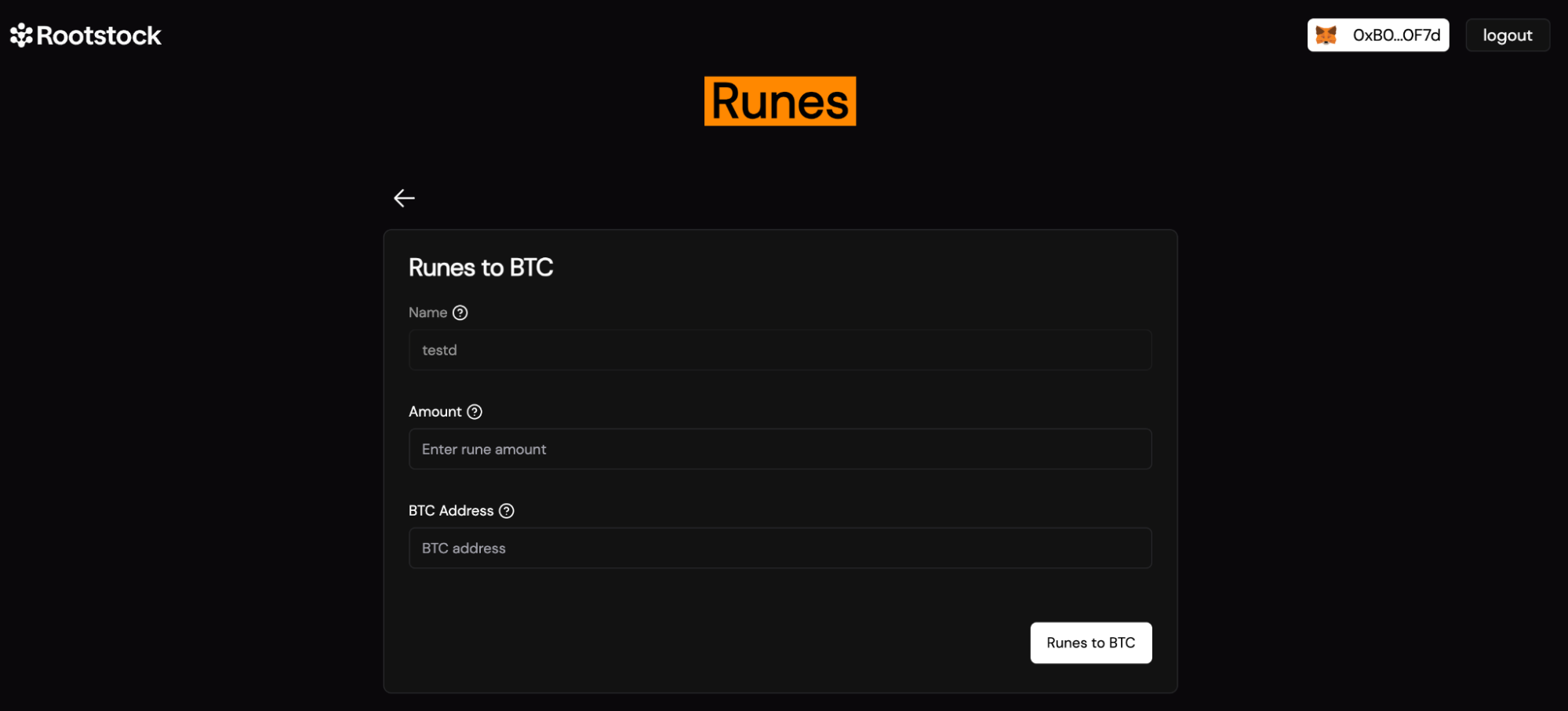 • After filling in the details, click on the "Runes to BTC" button to initiate the bridging process.